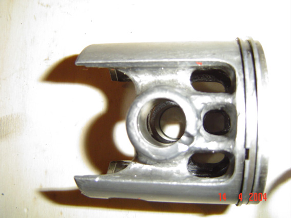 Da eine ganze Menge an Kleinteilen (verstärkter Kulukorb, Vergasernadeln, -düsen, Choke, Verbindungsgummi, Dichtungen, Zündkerzen, Packingplate) und Werkzeug (Digitaler Meßschieber, Drehmomentschlüssel, Fräsaufsätze, Dichtmittel, Loctite etc.) noch fehlte, mussten erstmal verschiedene Großbestellungen aufgegeben werden. Rund 200 Euro ärmer konnte ich endlich weitermachen: Der Zylinder wurde außlasseitig per Flex auf beiden Seiten tief "geschlitzt". Das soll eine bessere Wärmeabfuhr bringen. Zusätzlich habe ich den Zylinder noch geschwärzt (ebenfalls bessere Thermik). Der Zylindefuß bzw. der untere Teil der Laufbahn wurde ca. 2,5 cm gekürzt. So steht der Fuß nicht mehr direkt im Gasstrom des Membranansaugstutzens. Der untere Teil des Kolbens wurde ebenfalls gekürzt und gut verrundet. So ist die Bruchgefahr unterhalb des Kolbenhemdes minimiert. Außlasseitig wurden 4 x 2mm Löcher durch das Hemd gebohrt, was ebenfalls eine bessere Hitzeabfuhr und weniger Ruß unterhalb der Kolbenringe bringen soll. Die CVF Fenster wurden maximal erweitert.